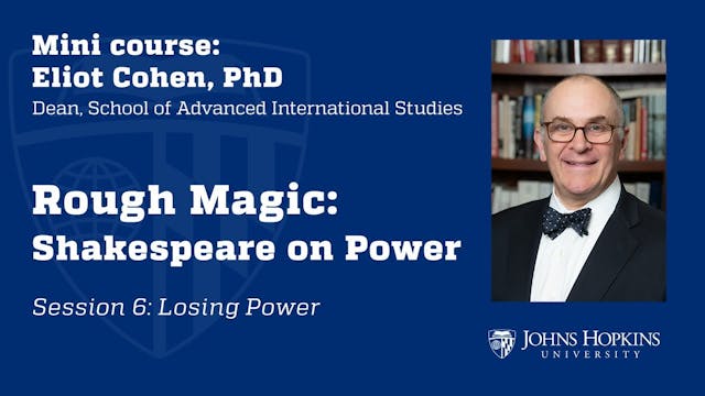 In Session 6, "Losing Power," Eliot Cohen, Dean of the School of Advanced International Studies, continues to explore the ways in which Shakespeare’s works display power. This session includes three sections entitled, "Arrogance and overreach" (8.5 minutes), "Fecklessness" (8.5 minutes), and "Bre...